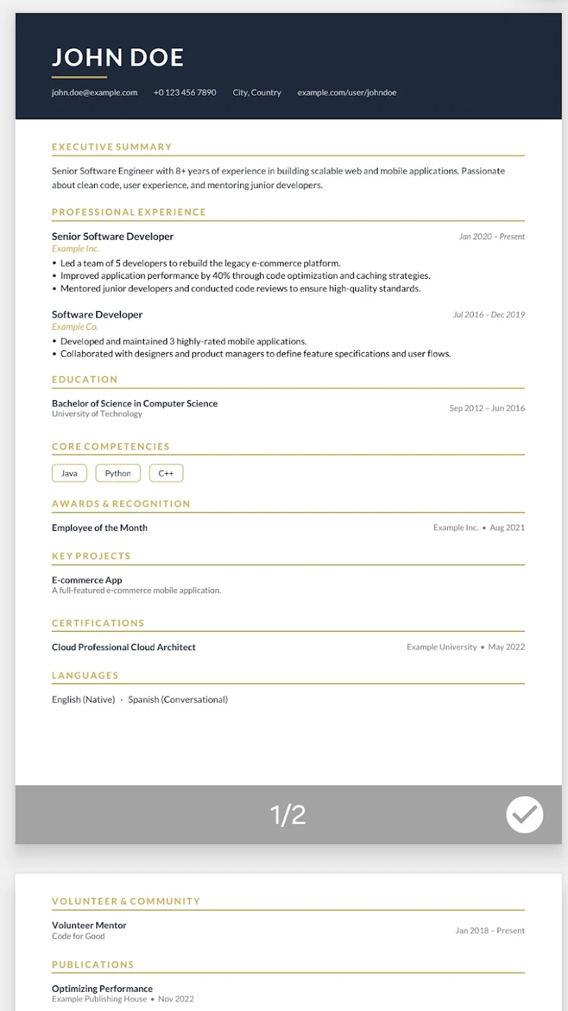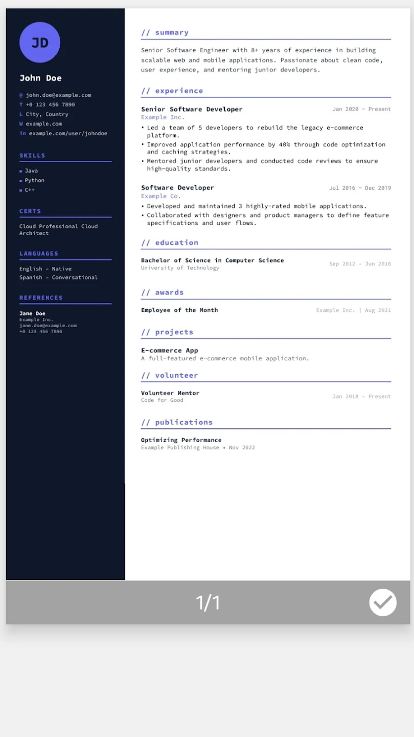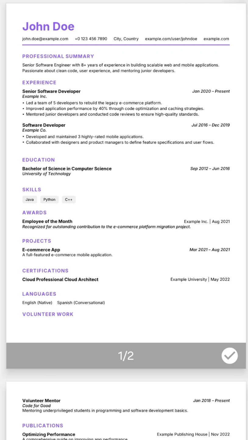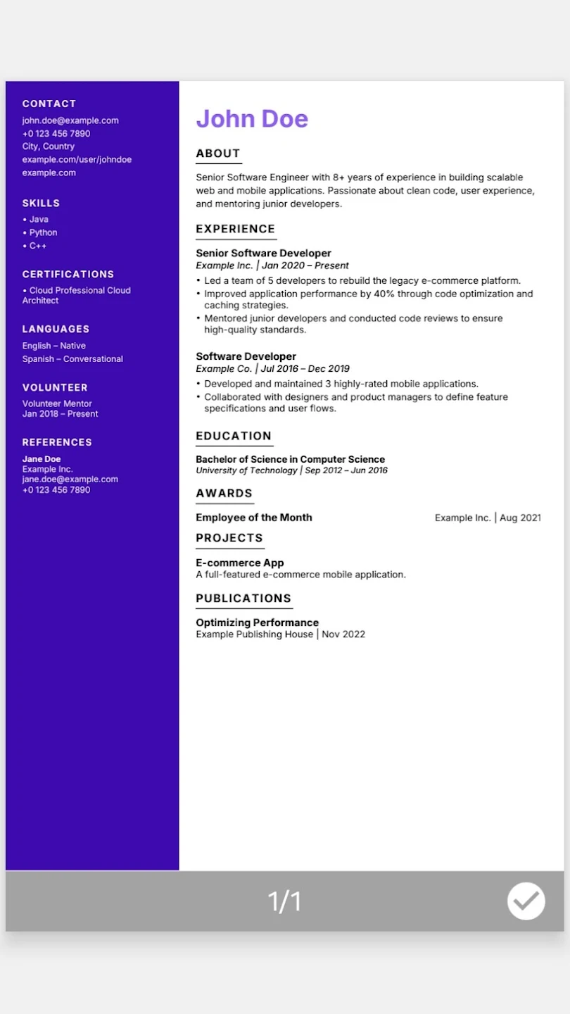 - Add education, experience, skills, projects, certifications, languages, volunteer work, publications, awards, and references in your resume